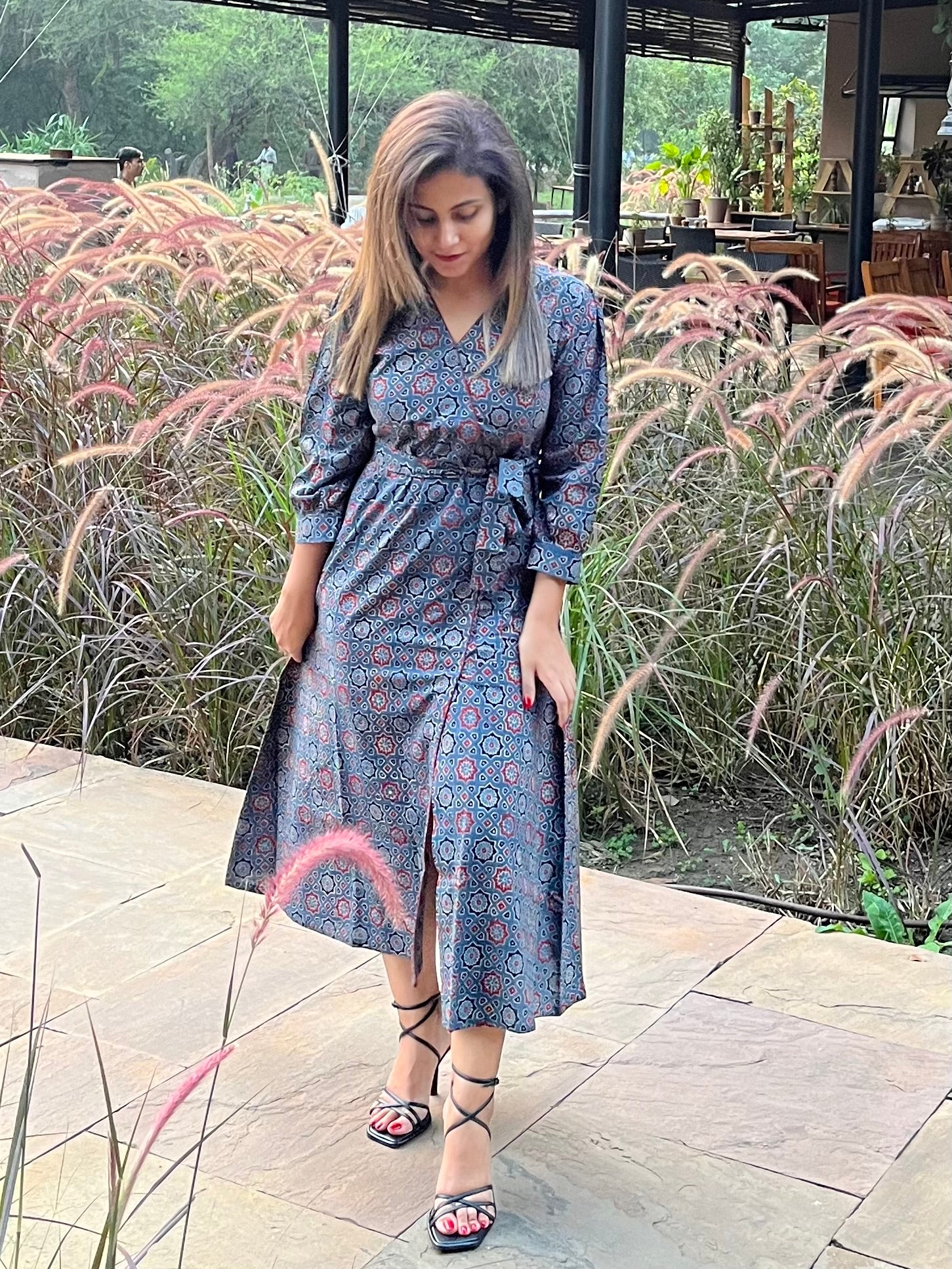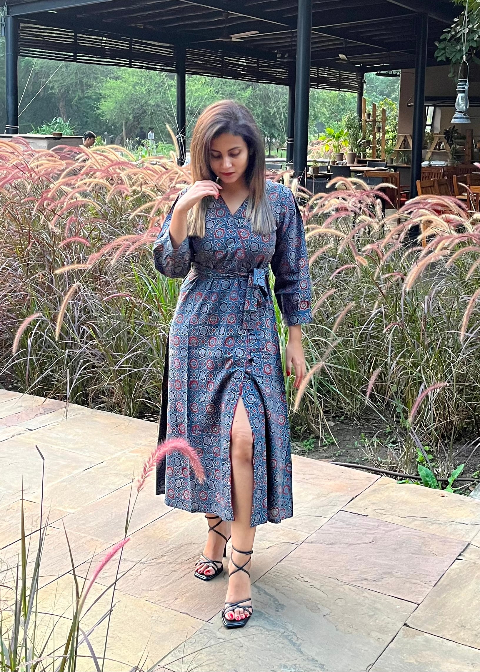 Ajrakh Indigo Dress made in Ajrakh Handblock printed cotton in our most loved silhouette is an exceptional limited edition piece featuring one of the most oldest printing methods. Ajrakh is an elaborate block printing technique practised in Kutch, Gujarat.