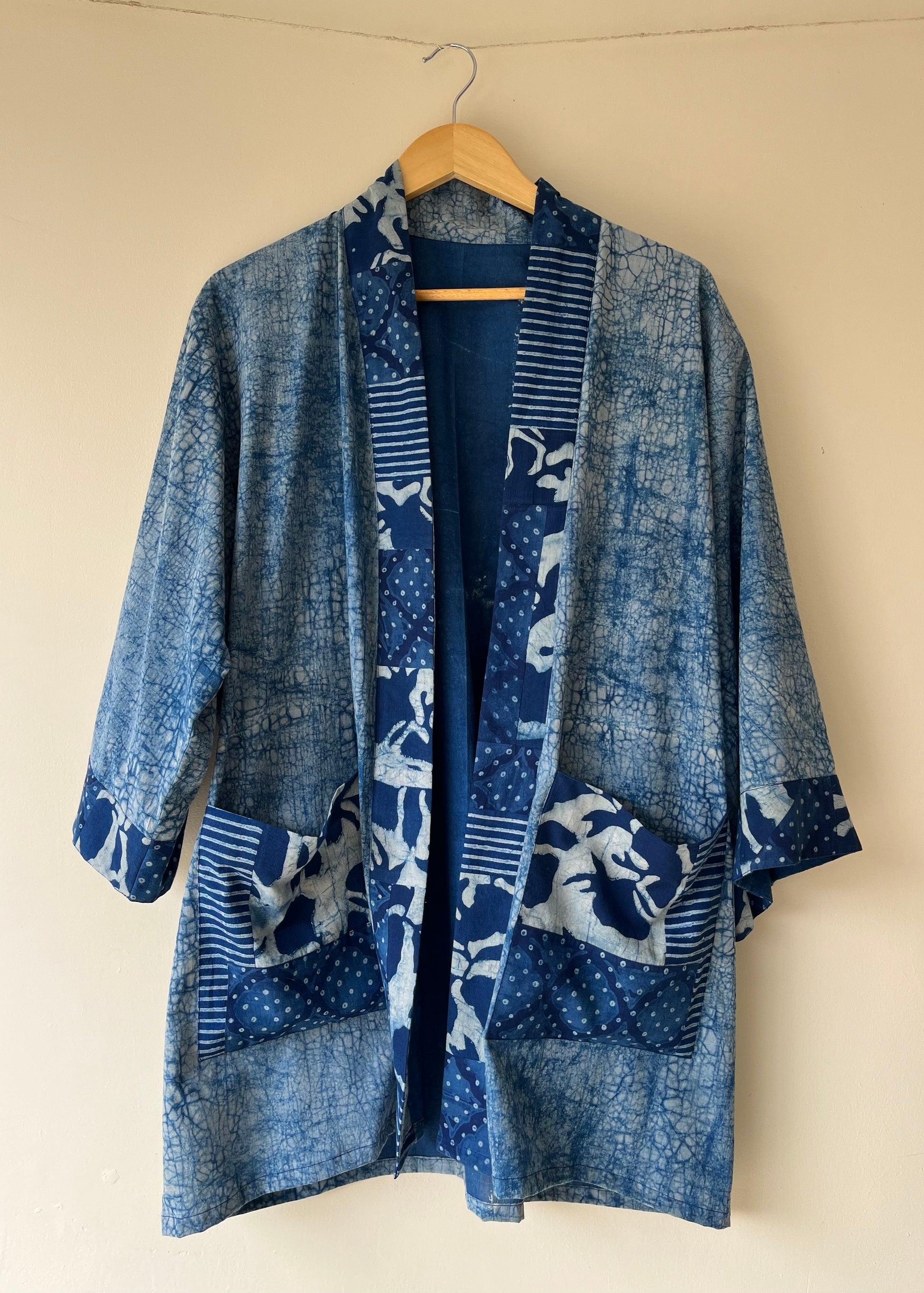 A breezy cotton hand-block printed shrug crafted in hand block printed Dabu, a mud resist hand block printing technique practised in Rajasthan.